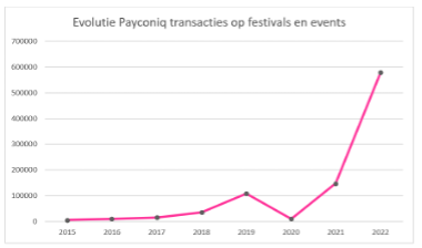 Dat we in 2022 weer een echte festivalzomer mochten beleven, zit daar voor een beetje tussen. In 2022 was de QR-code alomtegenwoordig op bijna 60 festivals en zomerbars (waar er dat in 2017 nog maar 9 waren). De festivalgangers ‘biepten’ ruim 578.000 keer met de Payconiq by Bancontact-app of een bancaire app die Payconiq aanbiedt om hun bakje friet of pintje bier te betalen – een veelvoud van vorige jaren, zoals te zien is op onderstaande grafiek.