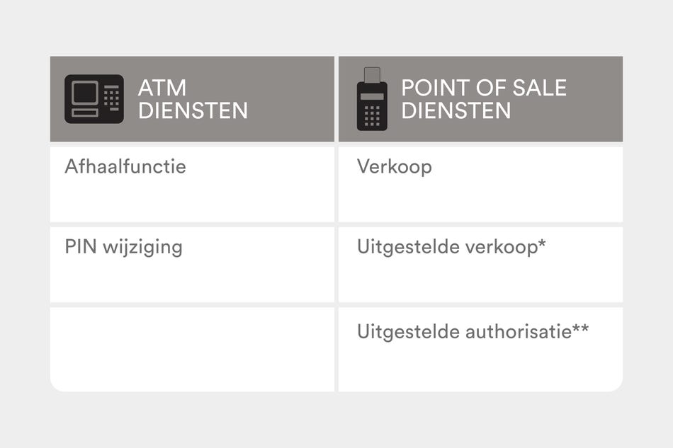Bancontact Company biedt u een real-time betalingssysteem aan dat geschikt is voor alle vormen van kaartbetalingen. Deze tabel geeft u een overzicht van de diensten die Bancontact Company u als business partner biedt.